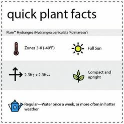 Flare will light a flame in your landscape with its fiery red blooms. In early summer, creamy white panicle blooms emerge from rich green foliage and begin to transform into richer and richer shades of pink and red as summer fades to fall. Flare grows in a tidy upright mound to the height of 3 ft. This hydrangea is very low maintenance and easy to care for. An excellent choice for cut flowers, which can be dried or used fresh in bouquets. Stems cut during summer may produce another flower in the fall. Pollinator-friendly and lightly fragrant after pollen is produced. This is1 of the most sought after hydrangeas on the market for its combination of color, natural size and ease of care. Variety botanical name: Hydrangea paniculata ‘Kolmavesu’ USPP26928, CPBR6047.