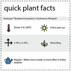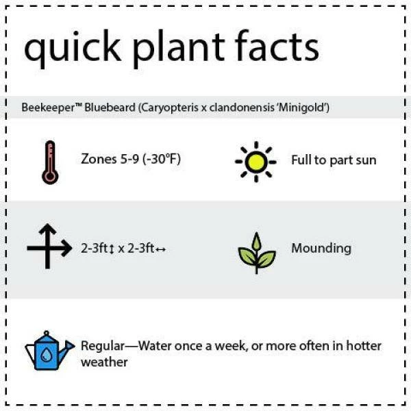 Beekeeper is a beautiful and easygoing shrub. Brilliant blue flowers sit atop bright gold-green foliage on this new and improved Bluebeard. It will bloom through summer and fall, welcoming pollinators from miles around. Beekeeper is low maintenance and perfect for beginners, yet special enough to excite seasoned gardeners, too. All it need is 4-6 hours of direct sunlight each day and regular watering as needed.