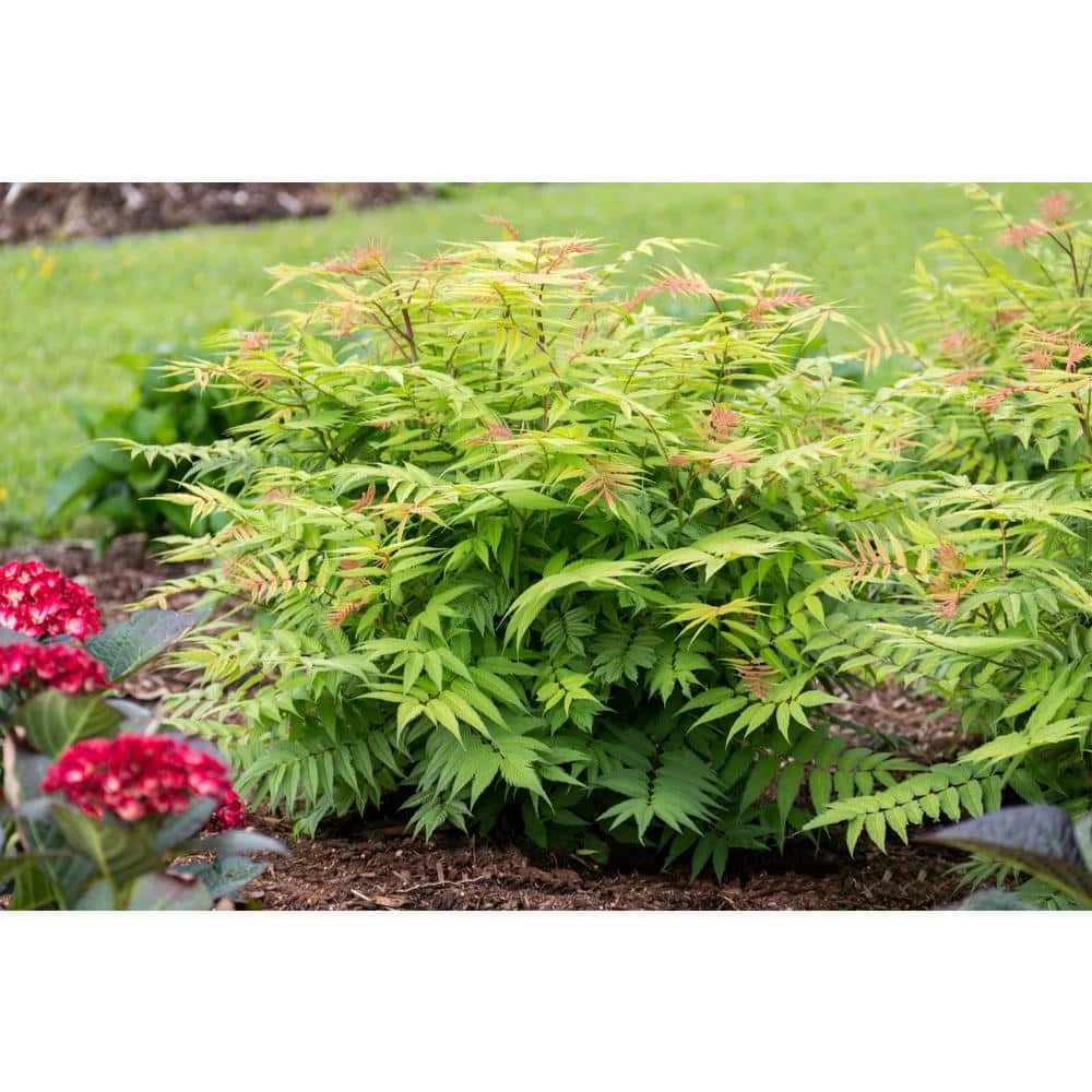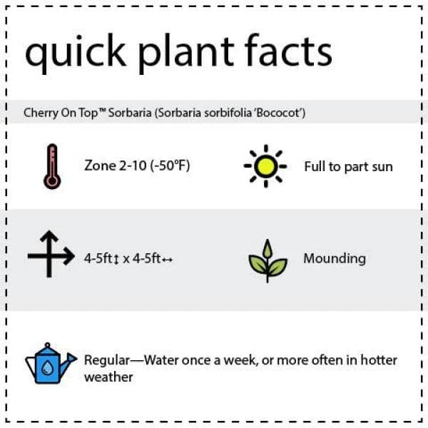 You get exciting colors all season long with the improved Cherry On Top Sorbaria. Experience this plant’s classic foliage beauty, with the added benefit of the perfect topping to complete your enjoyment. After the white plume flowers finish, savor clusters of bright, fresh-looking red seed pods instead of the traditional dried brown seeds. This extends the seasons of beauty you can enjoy through summer and fall. Added bouns, the birds love to snack on the seeds.