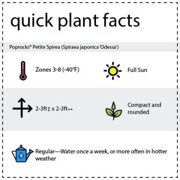 Poprocks Petite is a compact and beautiful little low-maintenance shrub. Eye-catching candy-pink button flowers pop against rich green foliage in the late spring, continuing to bloom throughout the season. Its tiny stature makes it great for patio pots, along a walkway, or at the front of a garden bed. Deer resistant and pollinator-friendly.
