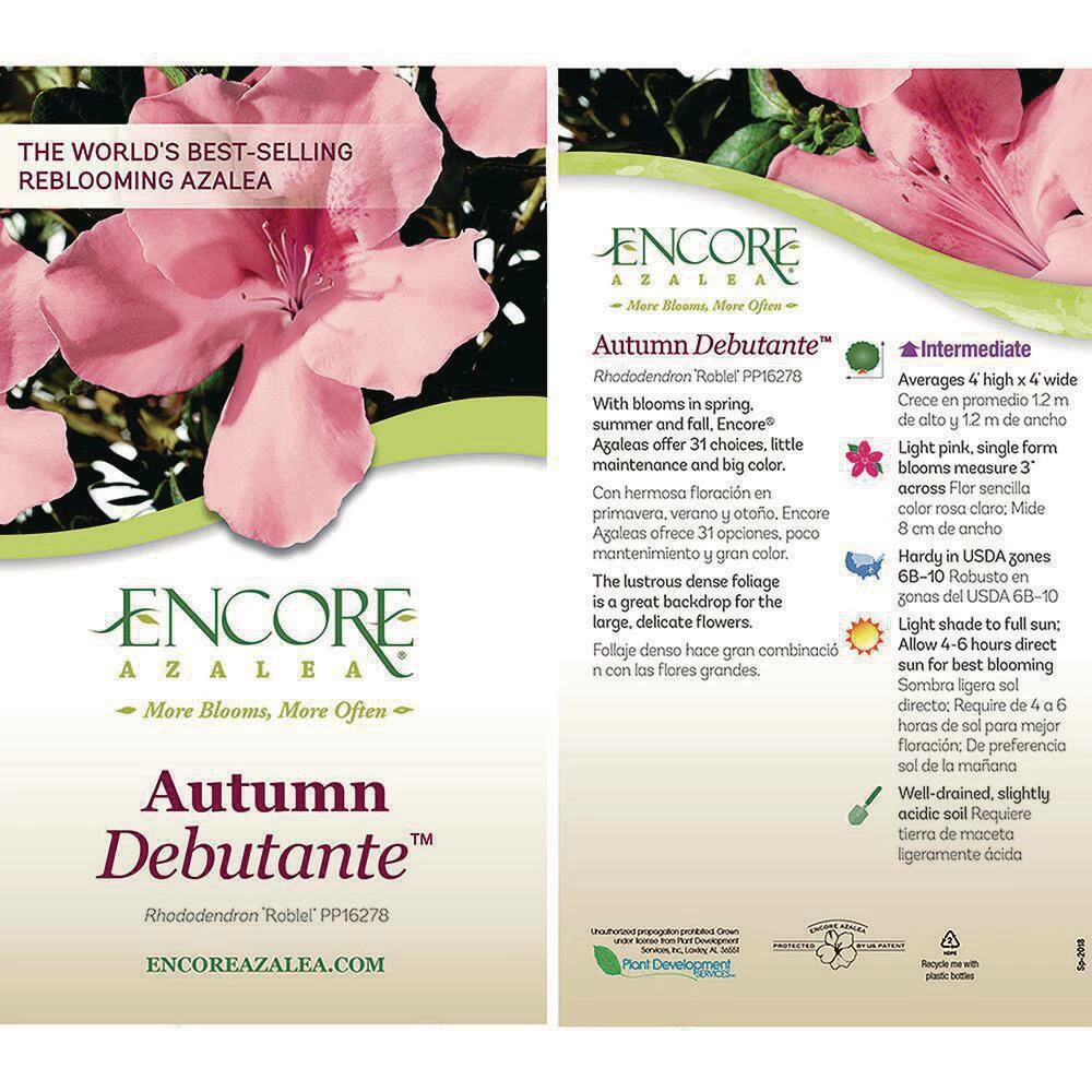 The Autumn Debutante is an intermediate-sized Encore Azalea that produces a great show of soft-pink single form blooms with a splash of dark pink freckles down the throat in spring summer and fall. The beautiful blooms contrast nicely against the dark lustrous green foliage. The Autumn Debutante is cold hardy down to USDA zone 6b. Encore Azaleas are known for their ability to tolerate full sun better than traditional azaleas, so make sure to plant them in a location that will receive 4-6 hours of direct sunlight, with some shade during the afternoon heat. Autumn Debutante is great for planting in the landscape or in container gardens and will perform best in slightly acidic well-drained garden soil!
