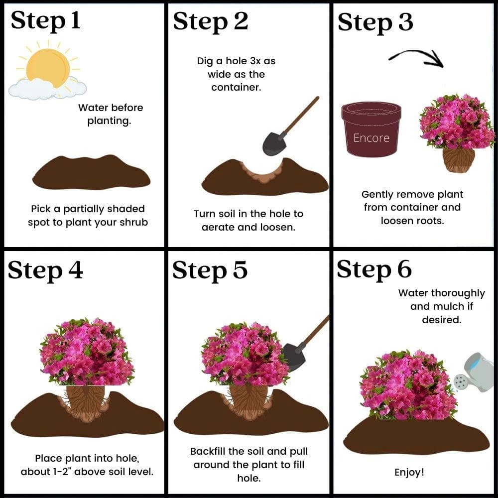 A unique group of azaleas, Encore azaleas bloom in early spring and set a second set of buds in midsummer that continue to flower through the fall. Beautiful at woodland’s edge or as a specimen, providing a long season of colorful blooms. An ideal addition to mixed containers that can be brought indoors when temperatures drop below freezing.