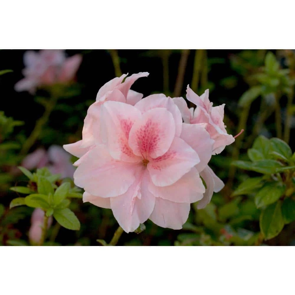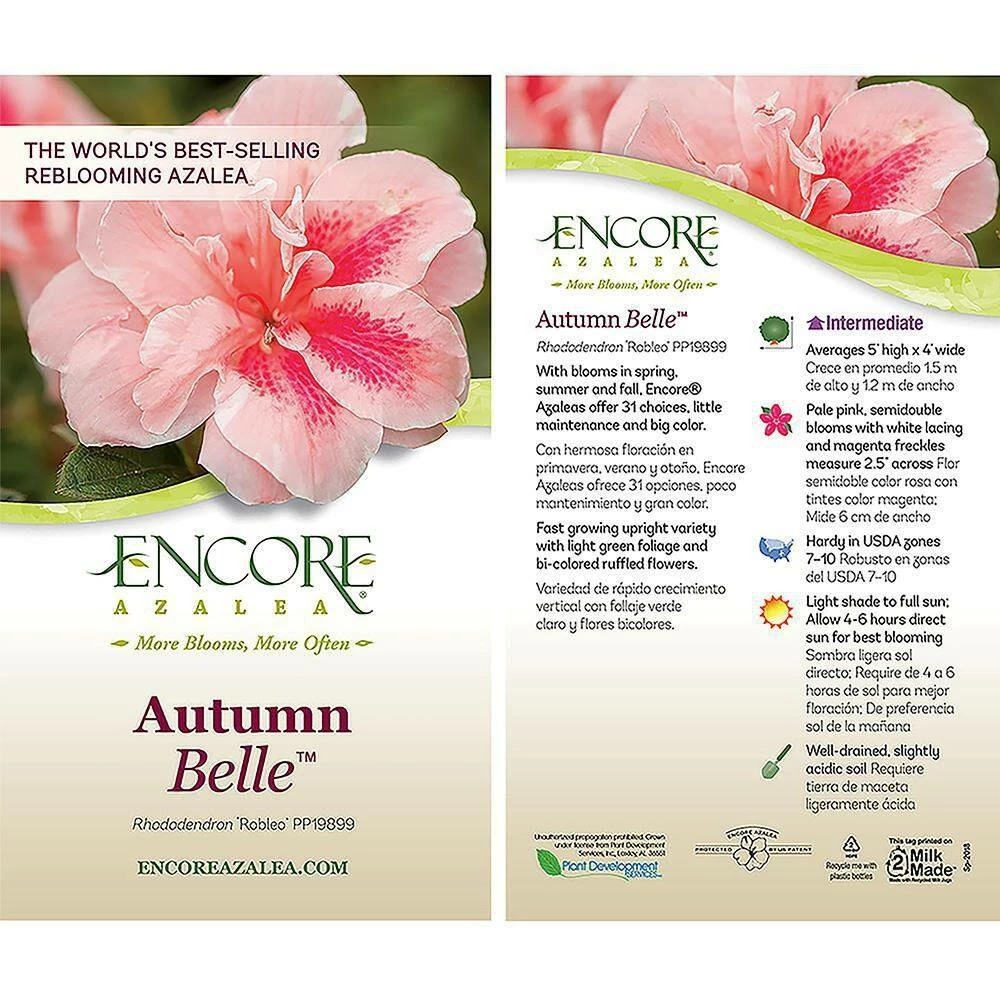 The Autumn Belle Encore Azalea produces bi-color ruffled blooms with pink-red specks in spring summer and fall. This evergreen shrub has lush green new foliage in spring that matured to a deep dark green that bronzes to a deep green-purple in winter that adds interest to the winter landscape. The Autumn Belle has a neat and compact intermediate growth habit that is very easy to maintain with minimal pruning. Use this azalea in your landscape or garden as a specimen, accent, low hedge or foundation. Autumn Belle is also great for planting in large pots either in a mixed container or a standalone!