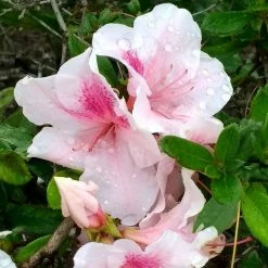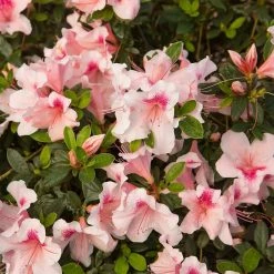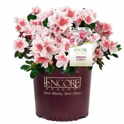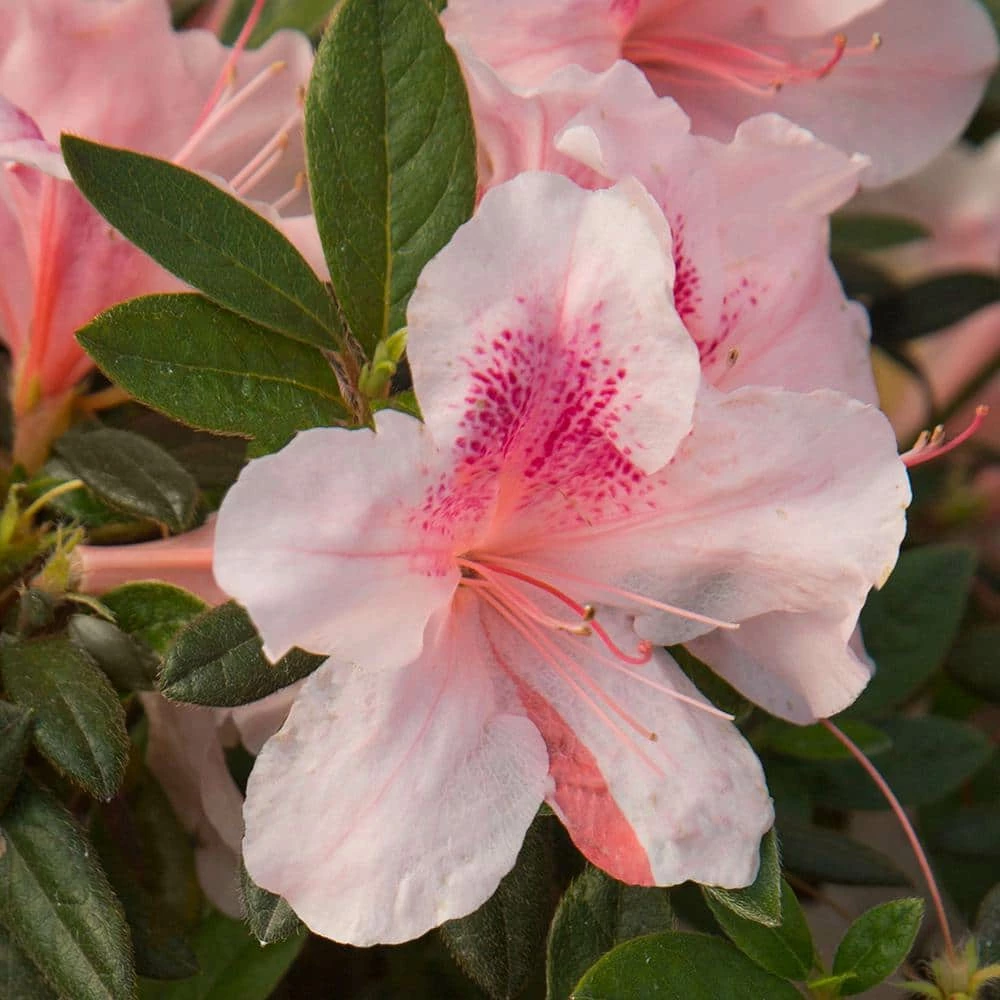 The Autumn Chiffon ENCORE AZALEA is a reblooming beauty that fits into any landscape or garden. The Autumn Chiffon produces bi-color blooms that tend to be bright white on the edges and whitish pink the closer you get to the center. Additionally, magenta pink freckles decorate the throat of these plentiful blossoms. This white and pink blooming azalea produces an initial flowering in spring, followed by a summer bloom cycle and fall bloom as well. Furthermore, the features a particularly sizable summer bloom period, somewhat atypical for reblooming azaleas. These blooms are medium-sized and traditionally measure around 2.75″ across. The characteristic white and pink blooms sit atop petite evergreen leaves with a defined point and slight fuzziness. New growth emerges as a bright light green, before maturing to a rich dark green hue. This variety reaches a mature size of 2.5′ H x 3′ W. Therefore, it’s perfect for mixed garden beds, borders and containers.