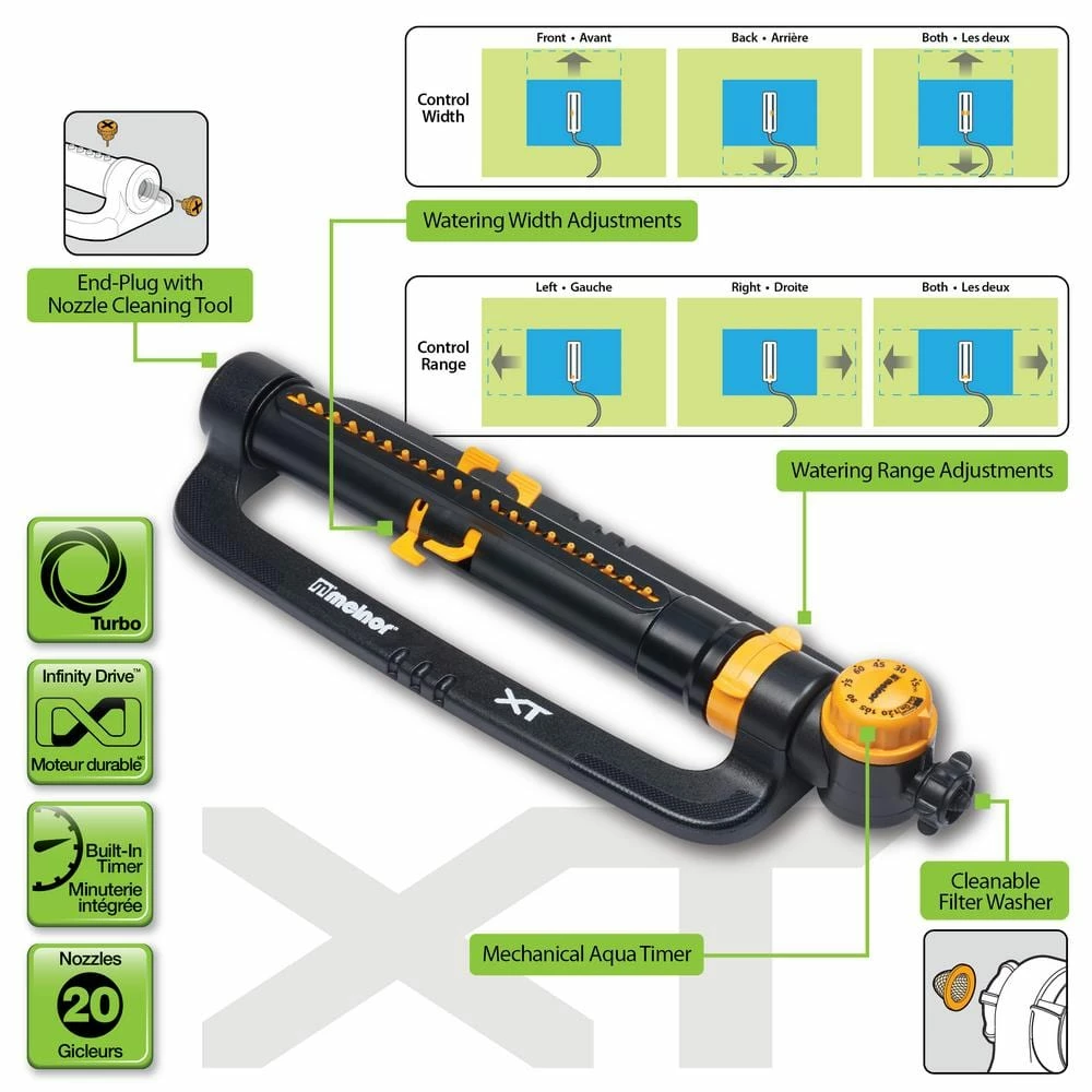 Water a large lawn or a small vegetable garden with up to 4,500 sq. ft. of adjustable coverage. TwinTouch split width adjustment directs the water precisely where you need it. Set the built in mechanically timer to water up to 2 hours, and it will automatically shut off when done. The dependable Infinity Turbo Drive provides smooth movements for even coverage that will not puddle. The durable design is built to last for green grass and beautiful blooms season after season.