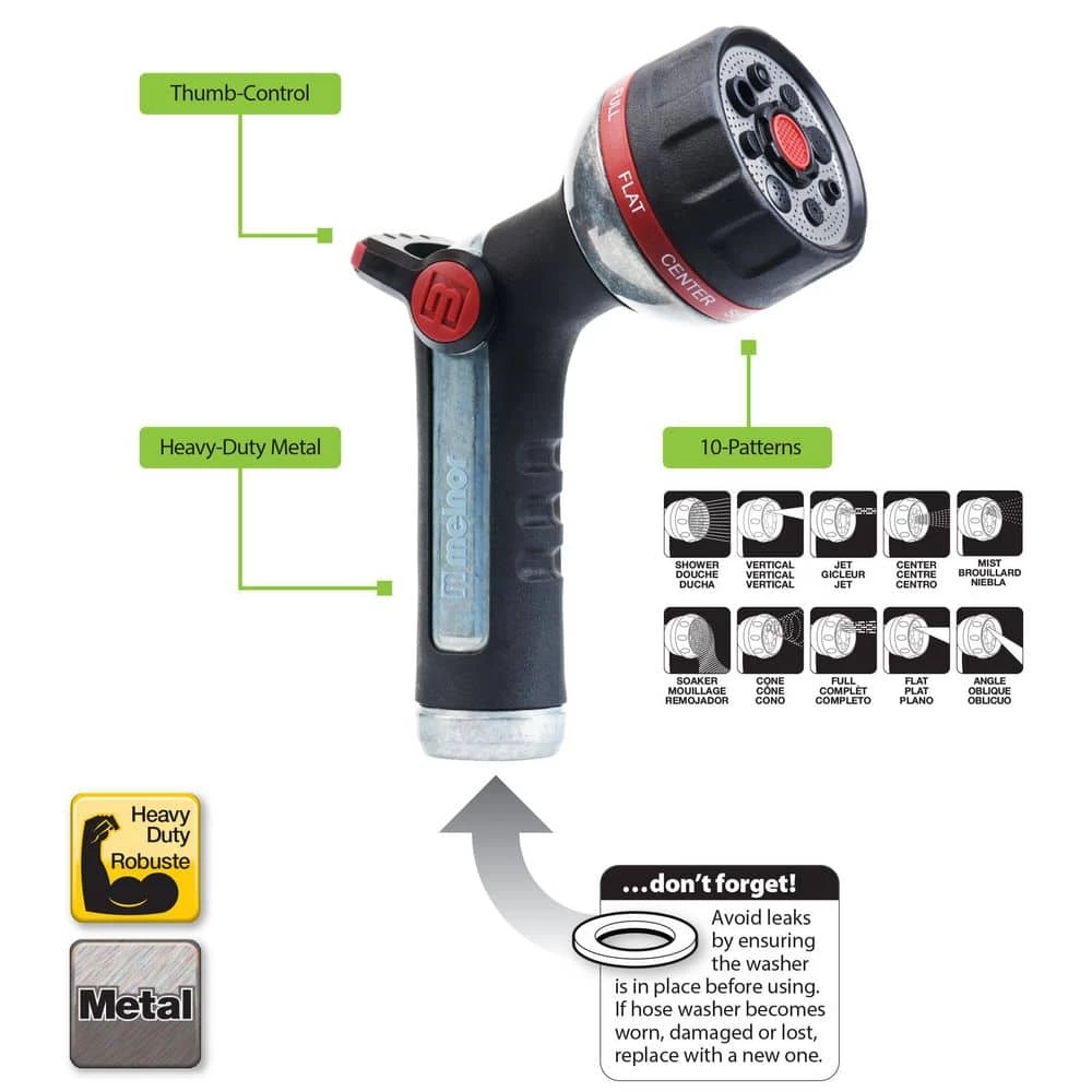 You can feel the quality and durability when you hold the heavyweight, metal flow control nozzle. The nozzle is designed to fit comfortably in the hand with soft rubber grips where you need them. Patterns are selected with a twist of the front turret while on, off and flow rate are easily controlled with one thumb lever.
