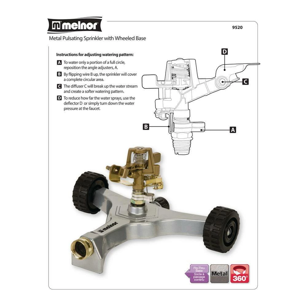 Easy to use and durable, this pulsating sprinkler is ideal for watering medium sized lawn areas. The wheeled base makes moving to the next area easy while the pulsating action promotes healthy lawn growth.