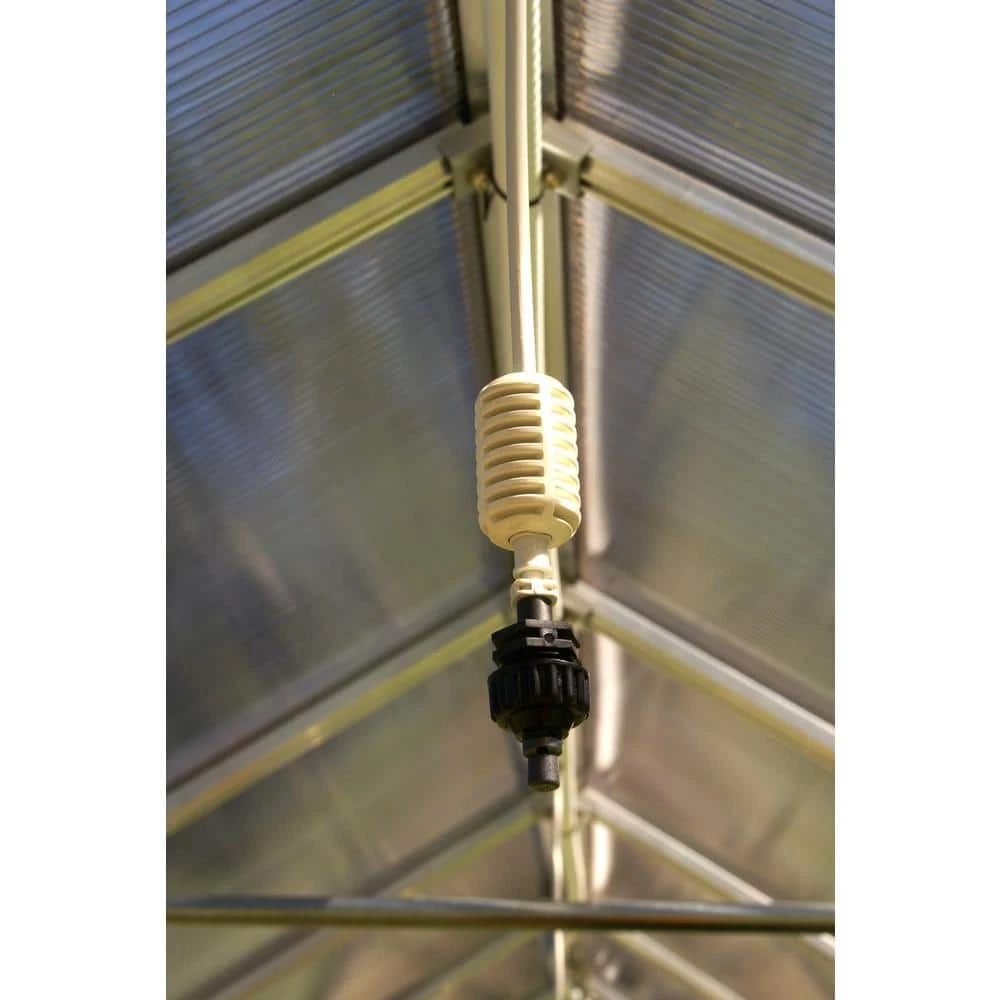 The MONT Automatic Greenhouse Watering System is designed for all greenhouses with rough interior dimensions of 8 ft. x 16 ft.. The Commercial grade system is similar to those used by professional growers. The Automatic Greenhouse Watering System is designed to be hung from the ceiling of the greenhouse. The 4 weighted sprinkler heads are separated by 4ft spray in a circular pattern. The Commercial digital timer is designed to allow for customer watering cycles based on climate and time of year. The Commercial grade hose is specifically designed to eliminate any bacteria or mold from the inside allowing for years of safe use. The end of the system is easily and quickly screwed onto one of the timer. The other end of the timer is screwed directly into the spigot.