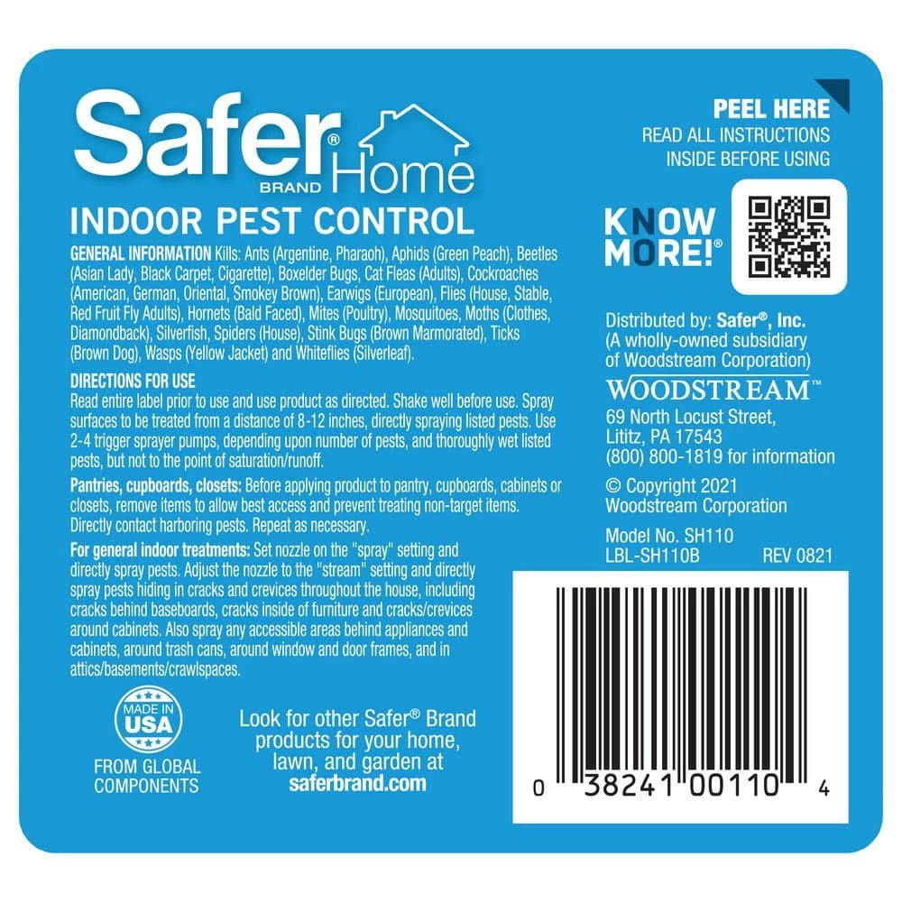 Don’t let uninvited pests invade your home- usher them out the door with Safer Home Indoor Pest Control Spray. This spray is effective against a variety of common household insects and kills ants, spiders, silverfish, roaches, fleas and more on contact. The quick-kill formula works fast to kill 100% of ants, flies, and roaches within 3 minutes. Its made with natural oils, including clove oil and cottonseed oil, so it’s safe for use around children and pets when used as directed. The ready-to-use spray bottle makes application a breeze. Simply shake the bottle before use. For general application, set the nozzle to the spray setting and hold the bottle 8 in. to 12 in. from the target area. For crack-and-crevice treatment, set the nozzle to the stream setting. Spray directly on pests until wet, but not to the point of runoff. Safer Home Indoor Pest Control Spray is perfect for use in kitchens and pantries, as well as behind baseboards, around windows and doors and in crawl spaces. Effective against: Ants (including Argentine, pharaoh, red imported fire), aphids, armyworms, bed bugs, beetles (Asian Lady, Black Carpet, Cigarette, Colorado Potato, Spotted Cucumber), boxelder bugs, cat fleas (adults and larvae), cockroaches (American, German, Oriental, Smokey Brown), earwigs, flies (Blue Bottle, Flesh, Horn, House, Stable), hornets, loopers, mites, mosquitoes, moths (Clothes, Diamondback), silverfish, spiders, stink bugs, brown dog ticks, wasps, yellow jackets and whiteflies.