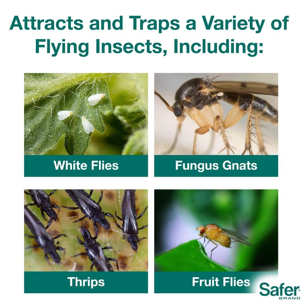 - Attracts and traps a variety of flying insects including white flies, fungus gnats, black-flies, thrips, fruit flies, midges and other flying insects