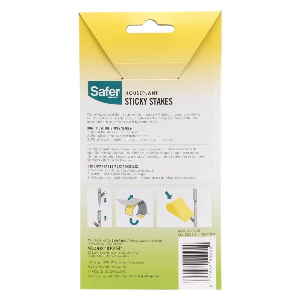 An insect infestation that has targeted your houseplants can be a sticky situation. Whiteflies, black-flies and midges are just a few of the many insects that can inflict plenty of damage on your plants in a short period of time. Safer Brand Houseplant Sticky Stakes can provide an effective, organic alternative to synthetic pesticides. Safer Brand Houseplant Sticky Stakes are ideal for use indoors or outdoors in potted plants. These sticky stakes for houseplants are an economical and convenient solution to the annoyances of whiteflies, fungus gnats, black-flies, thrips, fruit flies, midges and other flying insects. These houseplant sticky stakes contain no pesticides and are fully disposable. The yellow color of the trap as well as the glue will attract the insects. Shake the plant gently and insects hidden on the leaves will fly to the traps.