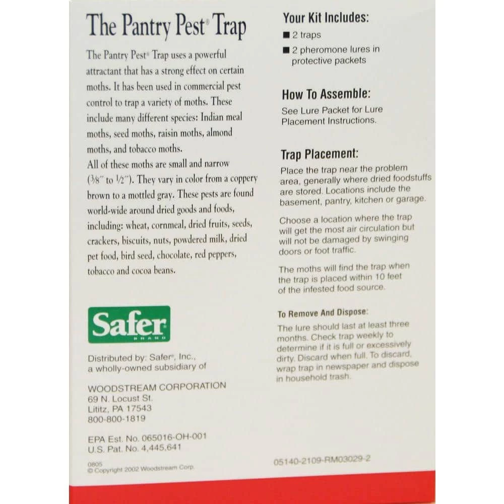 Protect your pantry. You could be bringing moths into your house without knowing it. This Pantry TPest Traos – 2 pack offers an economical and convenient natural pest control solution to moths flying around your pantry. Effective moth control starts and ends with the Safer Brand. The Safer Brand The Pantry Pest pantry moth trap controls moths and their larvae brought into your home in flour, grains and bird seed. This pantry moth trap should be used at the first sign of infestation. Each pantry moth trap will offer 400 sq. ft. of protection. This pheromone pantry moth trap is organic and safe for use around pets and children. Each lure will last up to 3-months.