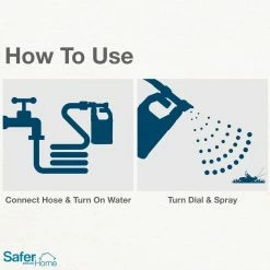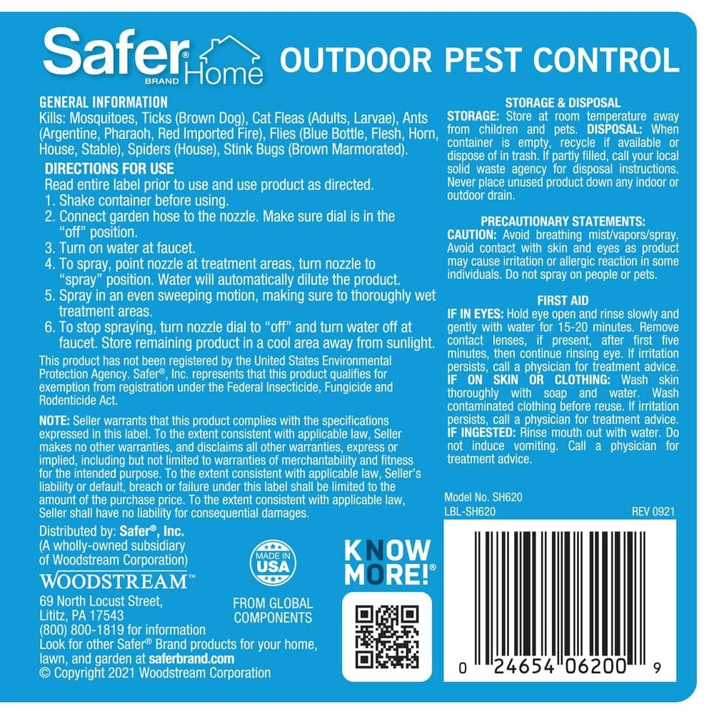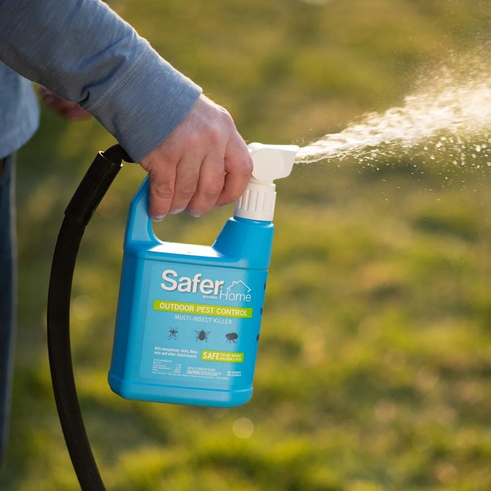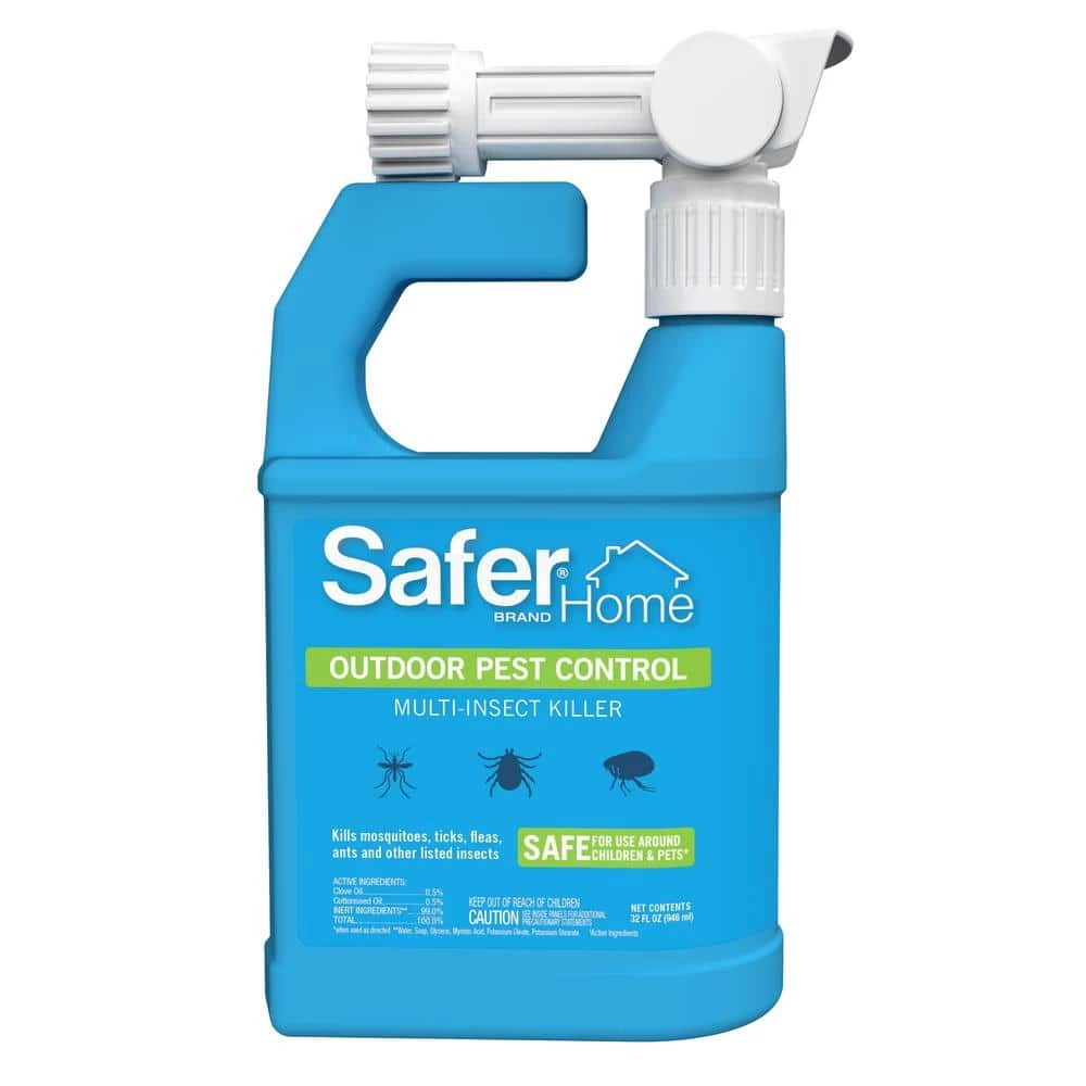 Don’t let uninvited pests invade your home and yard – usher them out with Safer Home Outdoor Pest Control Multi-Insect Killer Spray. This multi-purpose spray is effective against a variety of common outdoor insects and kills ants, mosquitoes, ticks, fleas, flies, stink bugs, and more on contact. The quick-kill formula is made with natural oils, including clove oil and cottonseed oil, so it’s safe for use around children and pets when used as directed. 1 bottle covers up to 5,000 sq. ft. for thorough outdoor protection. For your convenience, the easy-to-use hose-end spray bottle makes application a breeze! The concentrated formula requires no mixing, and the solution is mixed perfectly with water from your hose as you spray. Simply shake the bottle before use and attach the sprayer head to a hose (make sure the sprayer is in the OFF position). To begin spraying, point the nozzle where you want to spray, then bend the small plastic tab back, and turn the knob to the Spray position. This will combine water with the Safer Home Outdoor Pest Control Multi-Insect Killer to provide an even spray for your lawn, perimeter, or other target area! Spray in an even sweeping motion, making sure to thoroughly wet treatment areas. Effective against: Mosquitoes, Brown Dog Ticks, Cat Fleas (adults and larvae), Ants (including Argentine, Pharaoh, Red Imported Fire), Flies, (Blue Bottle, Flesh, Horn, House, Stable), House Spiders, and Stink Bugs (Brown Marmorated).