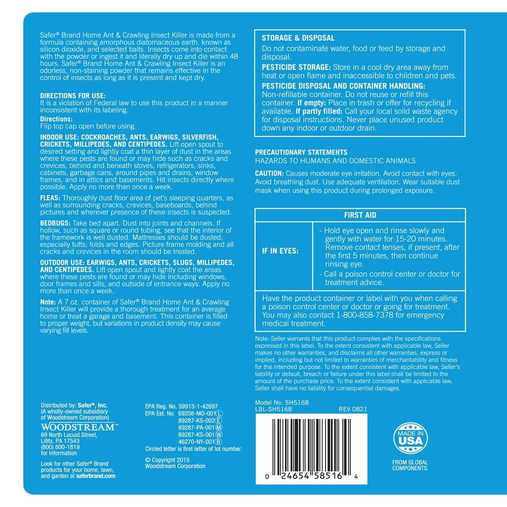 Safer Home Ant & Crawling Insect Killer is a powder made from diatomaceous earth and selected baits to kill roaches, ants, fleas, silverfish, earwigs, bedbugs, and other crawling insects within 48 hours after contact. Safer Home Ant & Crawling Insect Killer takes care of pest problems without harsh chemicals. The diatomaceous earth is made up of finely crushed algae fossils. Though it feels soft to the touch for us, each microscopic piece is like a tiny shard of glass to small insects. It damages insects’ exoskeletons as they move across it or ingest it. Insects become dehydrated and die within 48 hours after contact. Large infestations can take a few days for insects to make contact. This product comes in a convenient puffer bottle to ensure precise and easy application, even in tight spaces. Apply Safer Home Ant & Crawling Insect Killer in areas where you suspect or anticipate insect activity, or you can spread it as a barrier to entry points in your home. This product is suitable for application both indoors and outdoors. It is also OMRI Listed and compliant for use in organic gardening. Reapply after rain or watering to replace the powder that has washed away.
