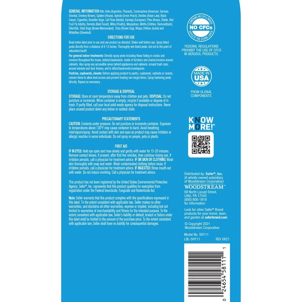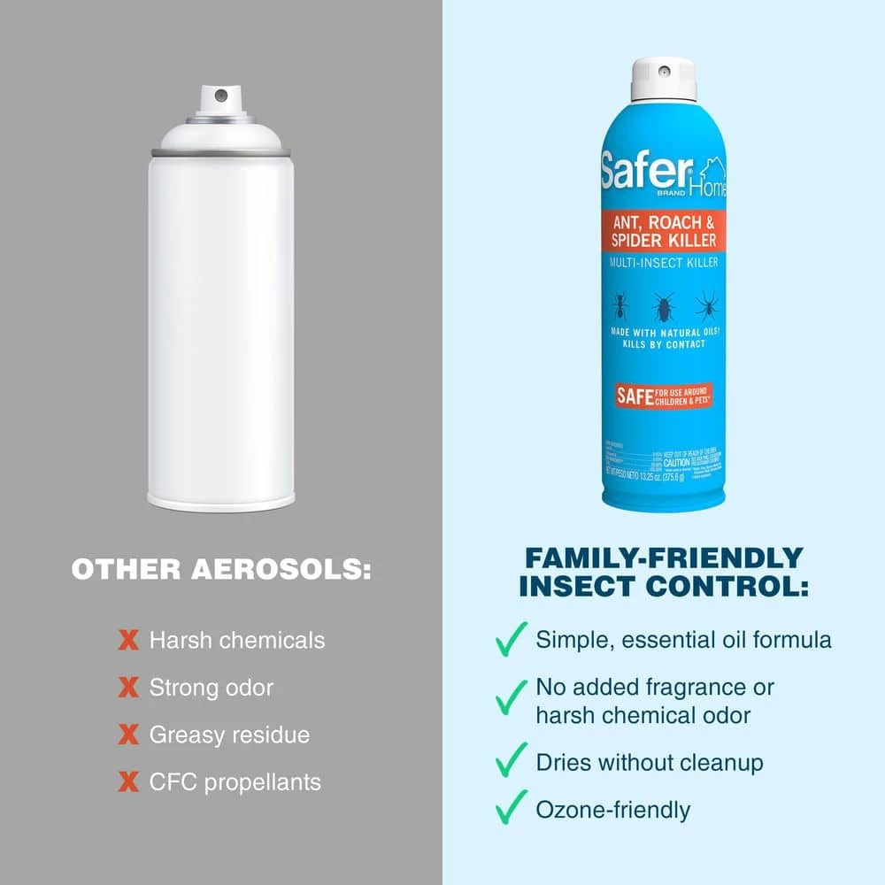 Don’t let uninvited pests invade your home – take control with Safer Home Ant, Roach & Spider Multi-Insect Killer Aerosol! This multi-insect spray is effective against a variety of household insects and kills ants, roaches, spiders, flies, silverfish, fleas, and more. The contact-kill formula works fast to kill 100% of ants, flies, and roaches within 3 minutes. It’s made with natural oils, including clove oil and cottonseed oil, and contains no harsh chemicals so it’s safe for use around children and pets when used as directed. The aerosol spray and contains no CFCs so it’s ozone friendly.For your convenience, the aerosol spray bottle makes application a breeze. Holding the bottle 8-12 inches from the target, spray directly on pests until wet, but not to the point of saturation. There’s no residue to wipe up – the spray will dry without cleanup. It is perfect for use in pantries, behind baseboards, in cracks and crevices, around windows and doors, and in attics, basements, crawl spaces, and other areas of your home.Effective against: Ants (Argentine, Pharaoh), Cockroaches (American, German, Oriental, Smokey Brown), Spiders (House), Aphids (Green Peach), Beetles (Asian Lady, Black Carpet, Cigarette), Boxelder Bugs, Cat Fleas (adults), Earwigs (European), Flies (House, Stable, Red Fruit Fly Adults), Hornets (Bald Faced), Mites (Poultry), Mosquitoes, Moths (Clothes, Diamondback), Silverfish, Stink Bugs (Brown Marmorated), Ticks (Brown Dog), Wasps (Yellow Jackets)